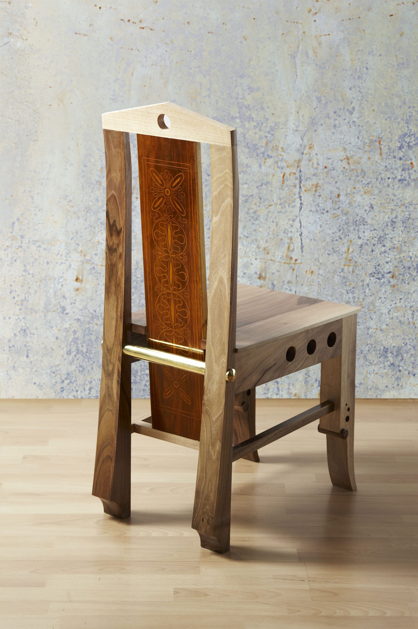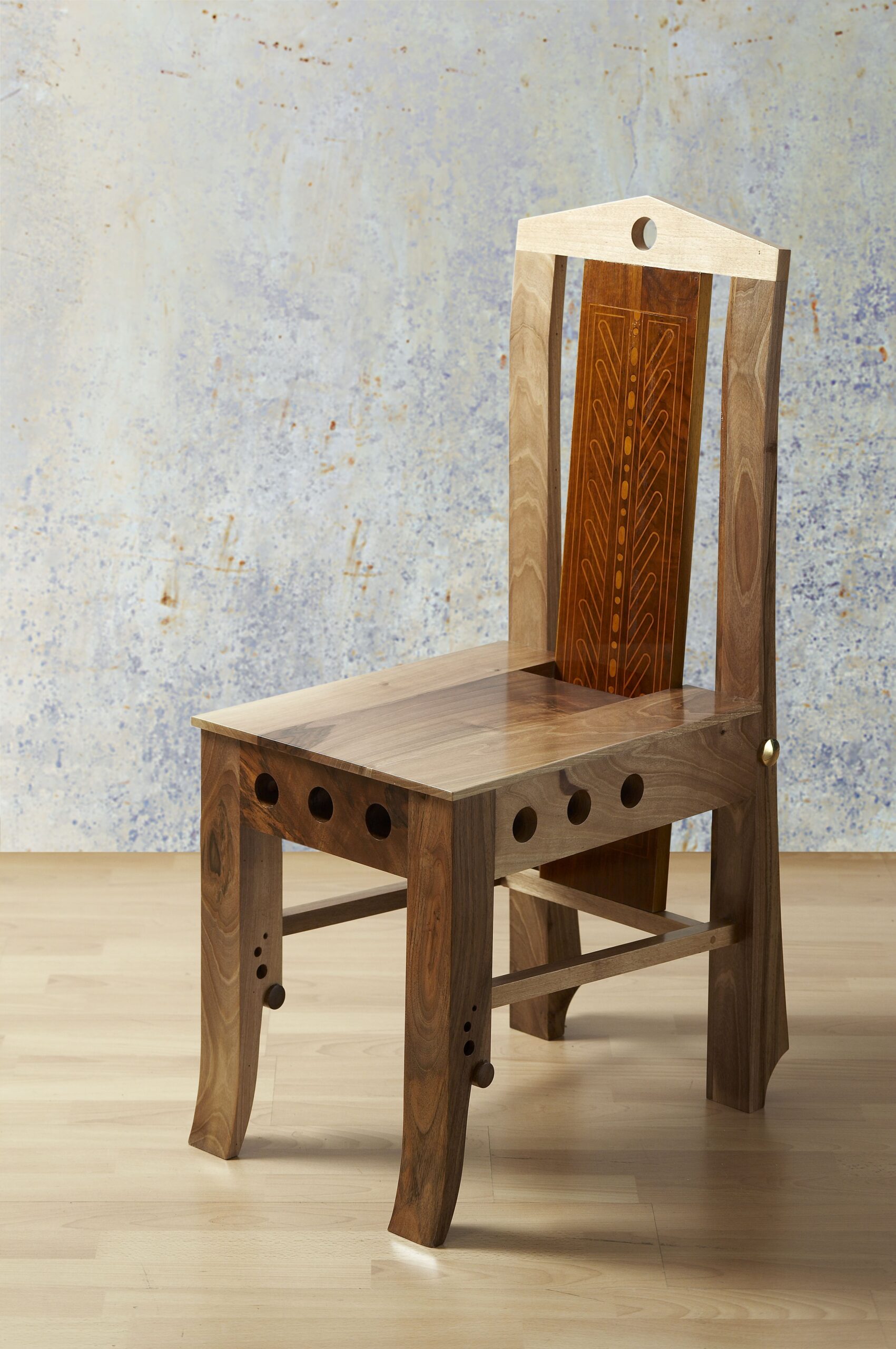 Intarzija v hrbtišču stola je bila prvotno izdelana leta 1935 po osnutkih Antona Suhadolca.